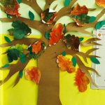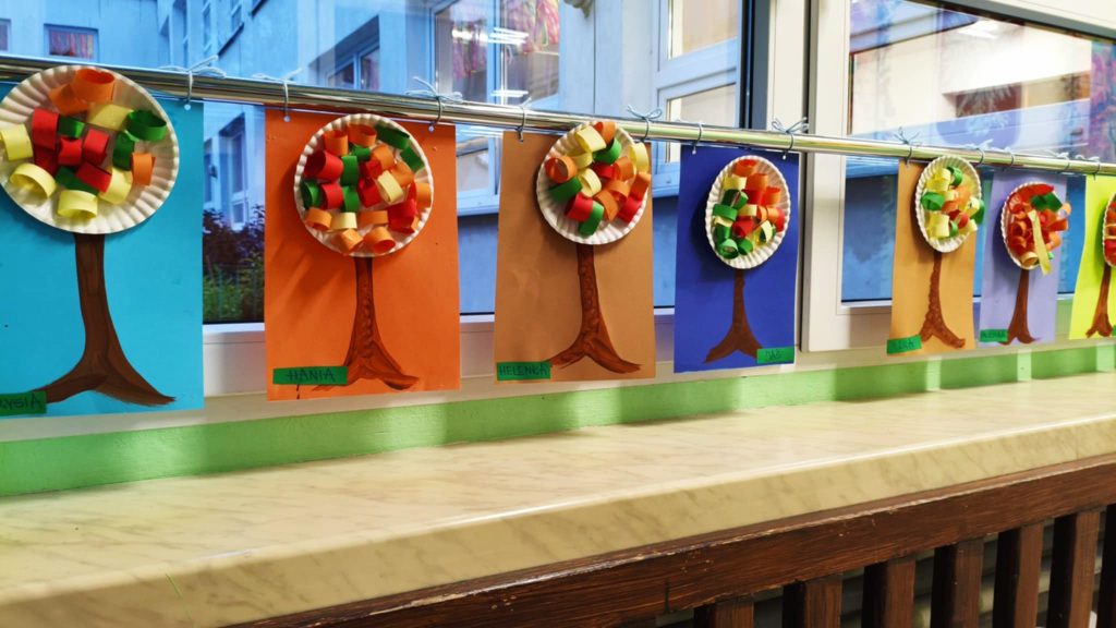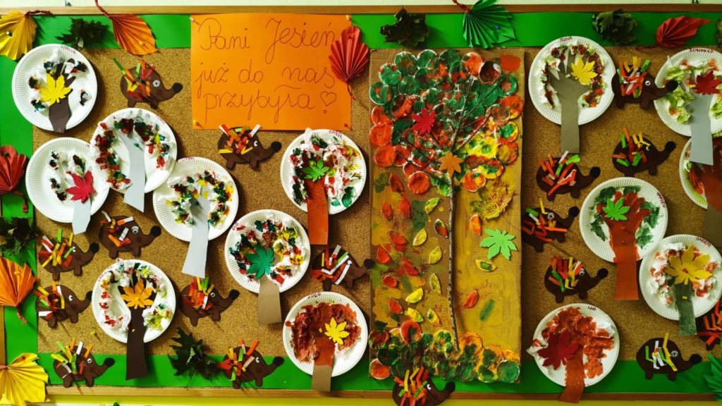 Korytarze naszego przedszkola rozświetliły się feerią barw! Dzieci z wszystkich grup z radością tworzyły jesienne prace plastyczne, inspirowane kolorami i urokami tej pięknej pory roku. Na tablicach można podziwiać malowane farbami liście, wyklejane kolorowym papierem i bibułą drzewa, a także wesołe jeżyki, grzybki i jesienne bukiety.