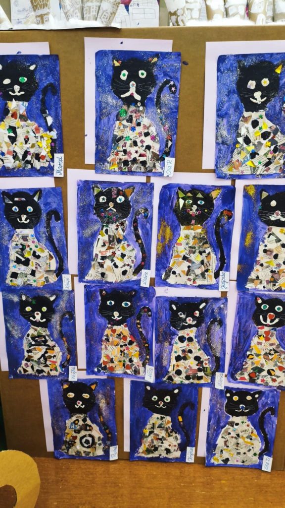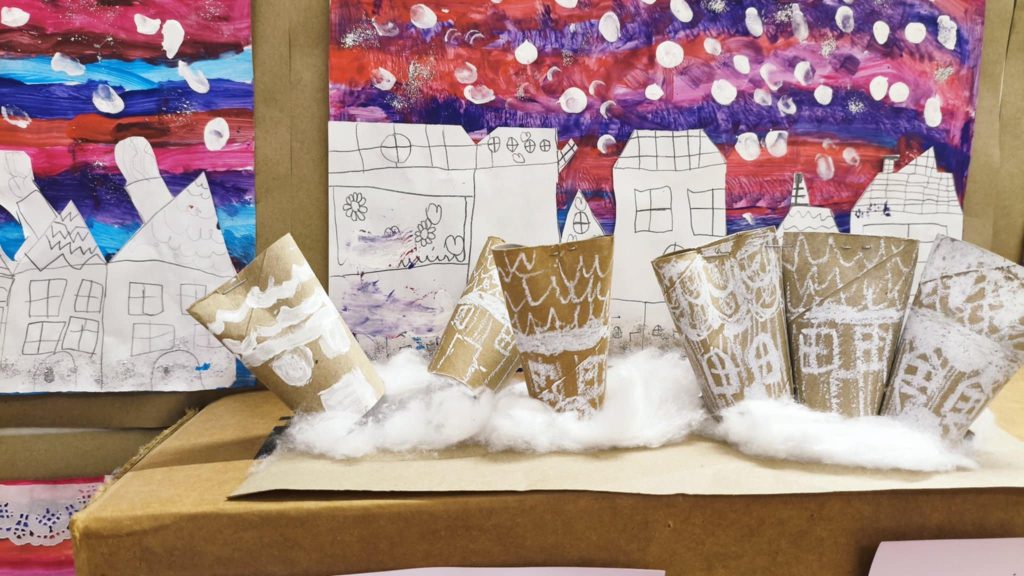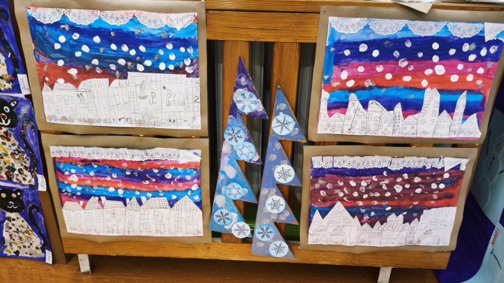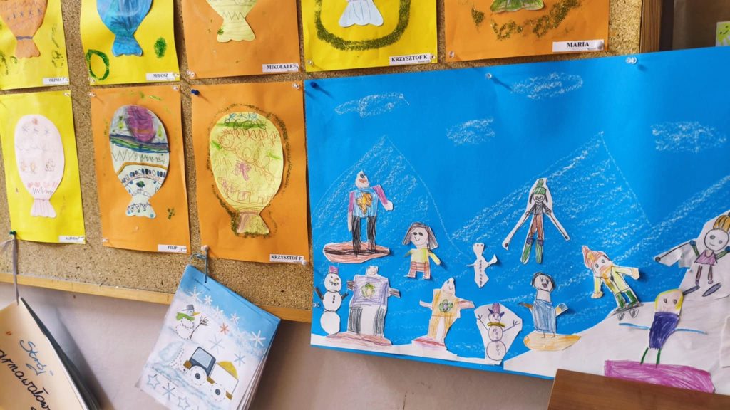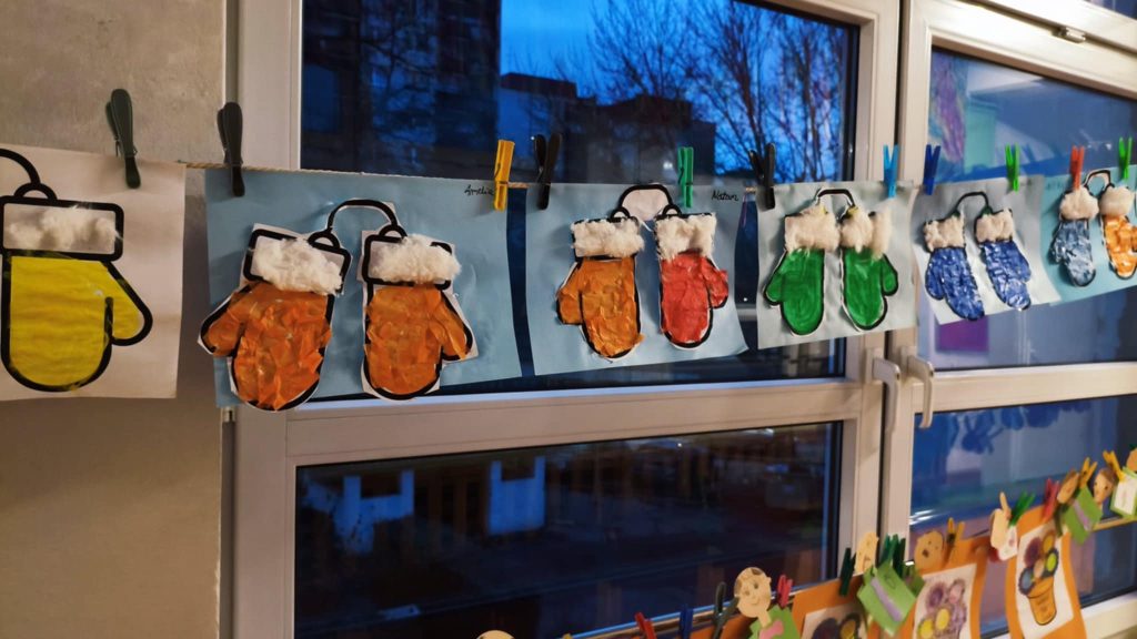 Dzieci wykonały wesołe, zimowe prace plastyczne i pokazały, że zima wcale nie jest taka zła. Na wystawach pojawiły się bałwanki, śnieżne płatki, drzewa i dzieci bawiące się na dworze. Przedszkolaki malowały farbami i wyklejały watą, tworząc piękne, zimowe krajobrazy. Choć za oknem śniegu brak, to nasze przedszkolne korytarze są pełne bałwanków i śnieżnych zasp 🙂