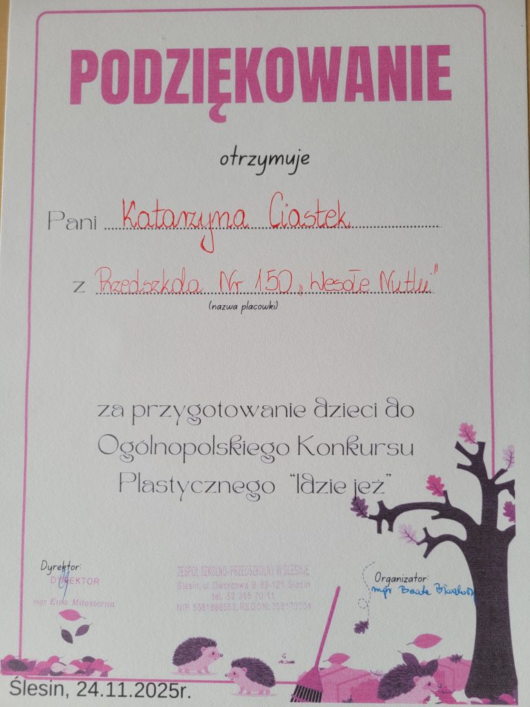 Krystian Ż. z gr. VII oraz Pola M. z gr. IX wzięli udział w II edycji ogólnopolskiego konkursu plastycznego pn. „Idzie jeż”. Organizator konkursu: Przedszkole w Ślesinie.