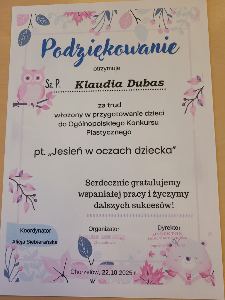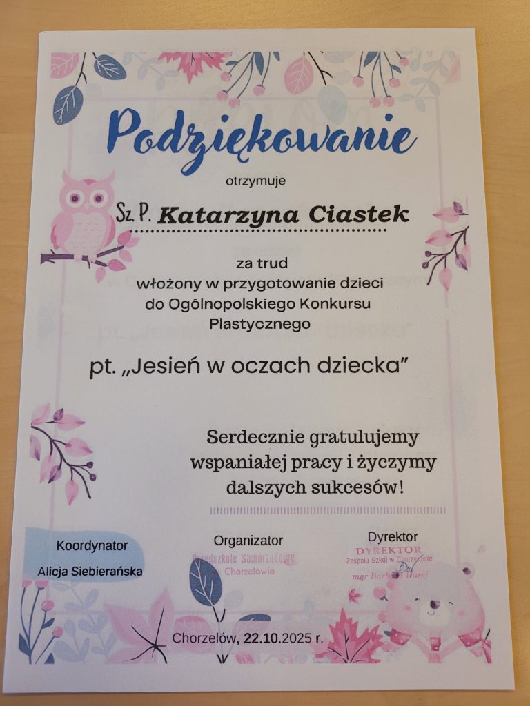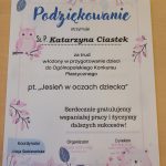 Hanna R. z gr. VII oraz Franciszek C. z gr. IX wzięli udział w ogólnopolskim konkursie plastycznym pn. „Jesień w oczach dziecka”. Organizator konkursu: Przedszkola Samorządowe w Chorzelowie.