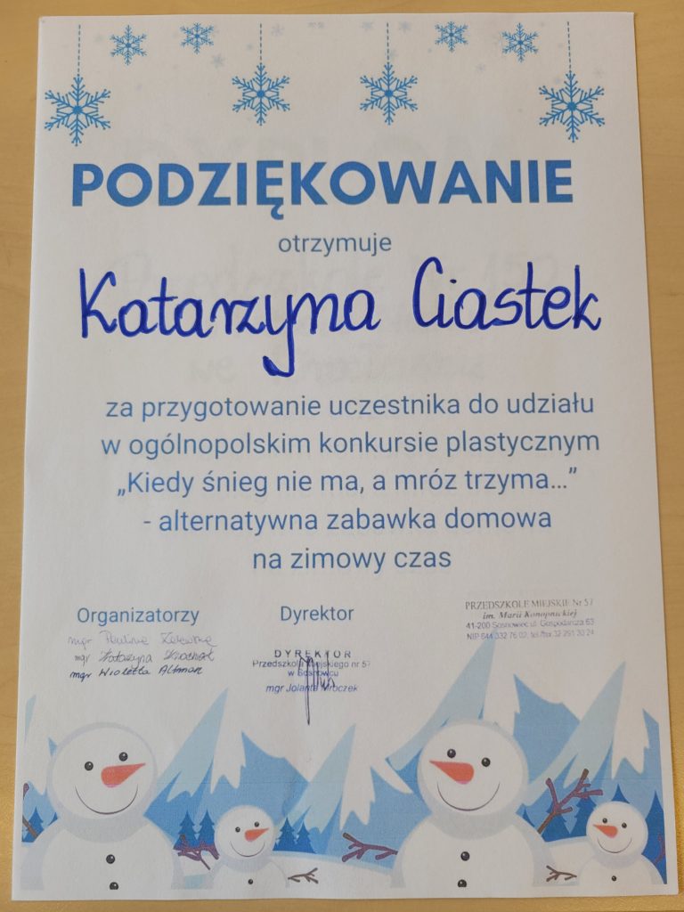 Michał R. z gr. VII oraz Emil. P. z gr. IX wzięli udział w ogólnopolskim konkursie pn. „Kiedy śniegu nie ma, ma mróz trzyma…”. Organizator konkursu: Przedszkole Miejskie Nr 57 im. M. Konopnickiej w Sosnowcu.