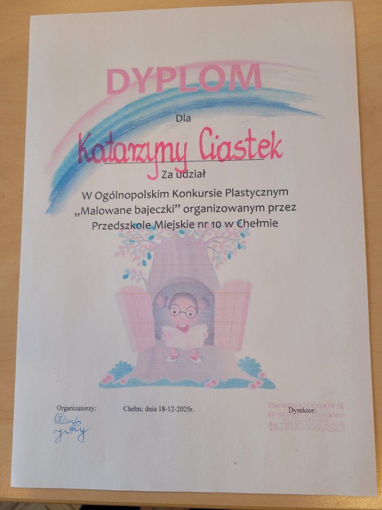 Natalia O. z gr. VII oraz Julia J. z gr. IX wzięły udział w ogólnopolskim konkursie plastycznym pn. „Malowane bajeczki”. Organizator konkursu: Przedszkole Miejskie Nr 10 w Chełmie.