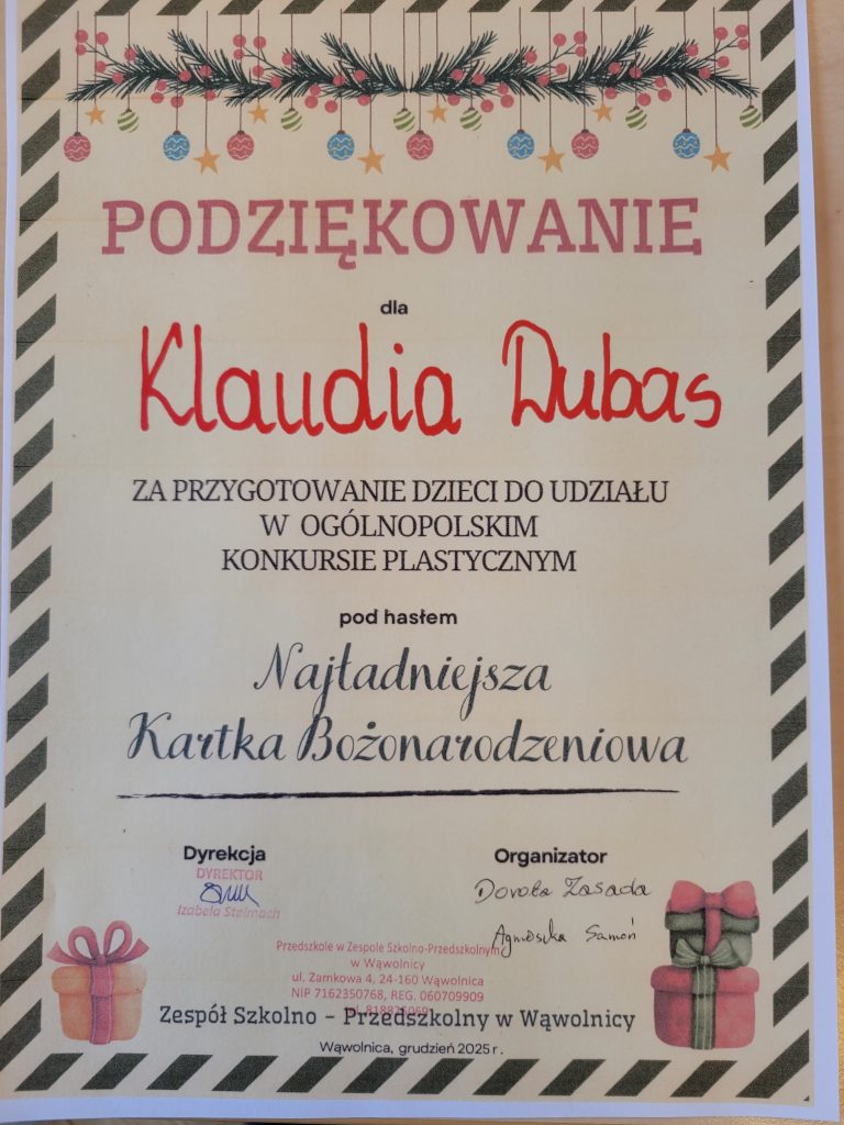 Bartosz F. z gr. VII oraz Michał G. z gr. IX wzięli udział w ogólnopolskim konkursie plastycznym pn. „Najładniejsza Kartka Bożonarodzeniowa”. Organizator konkursu: Zespół Szkolno – Przedszkolny w Wąwolnicy.