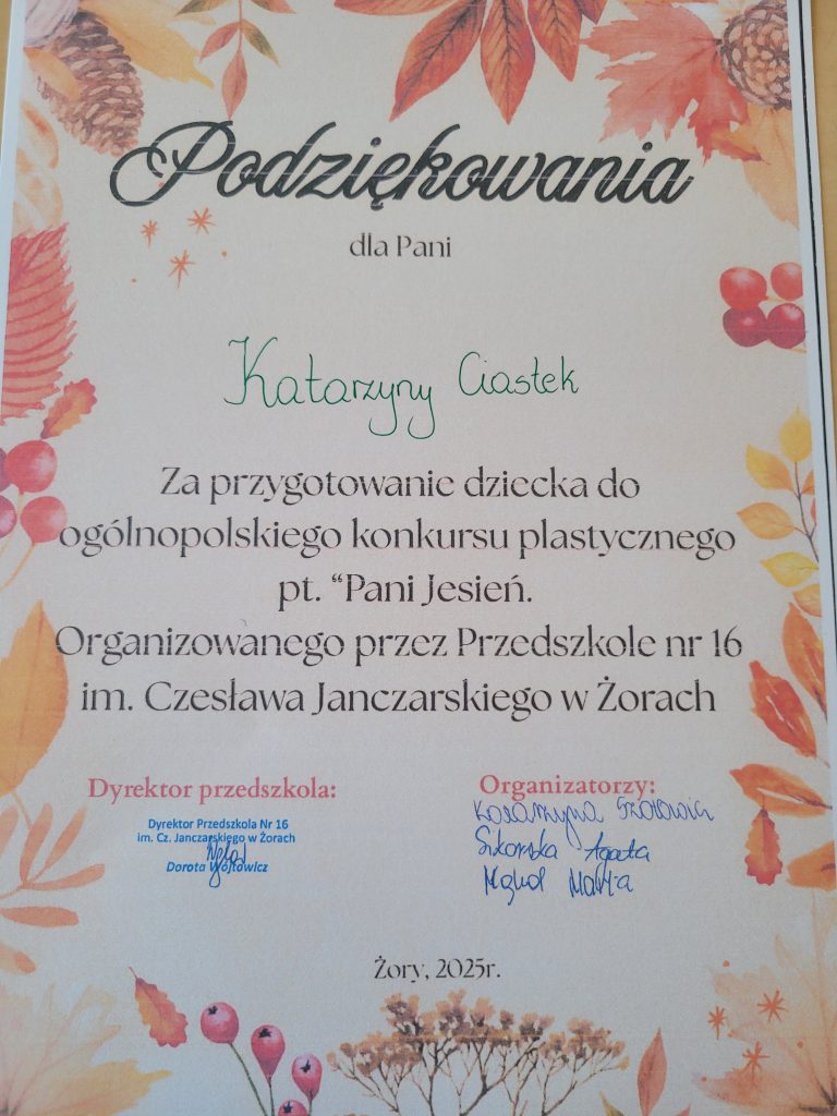 Iga T. z gr. VII oraz Apolonia W. z gr. IX wzięły udział w ogólnopolskim konkursie plastycznym pn. „Pani Jesień”. Organizator konkursu: Przedszkole Publiczne Nr 16 im. Czesława Janczarskiego w Żorach.