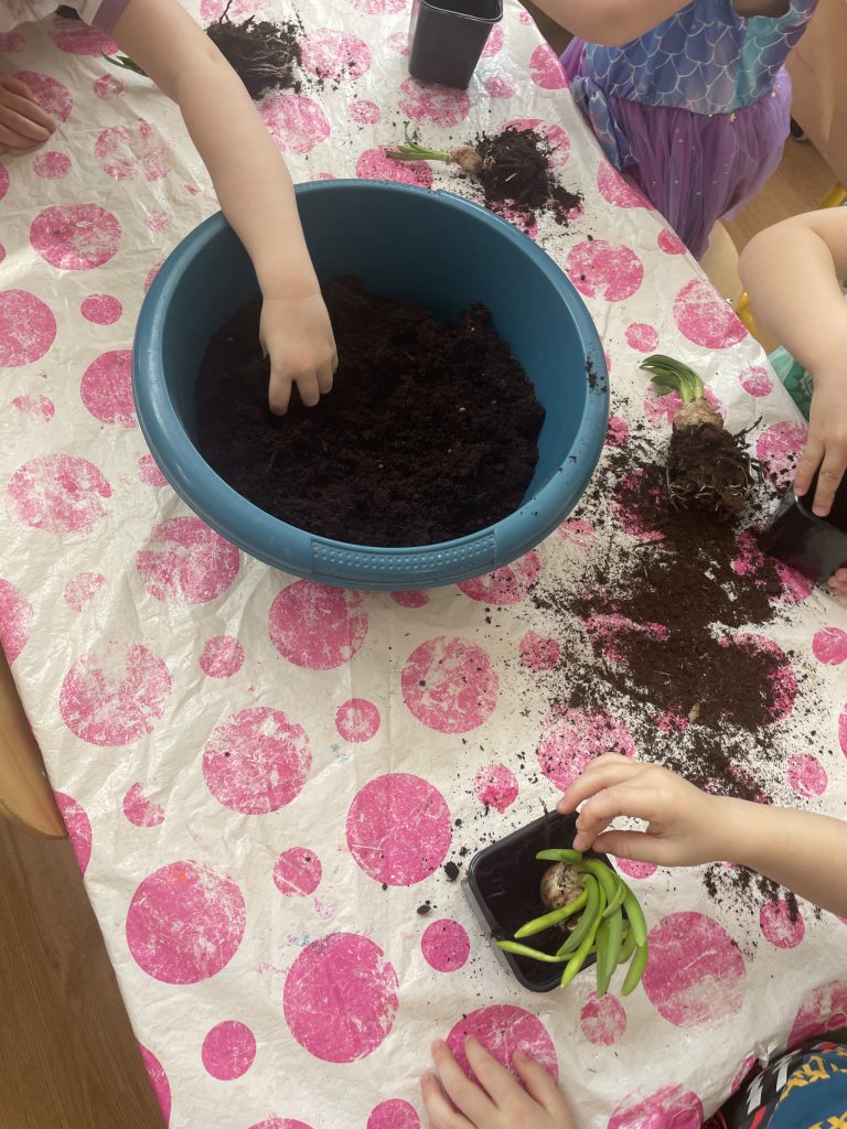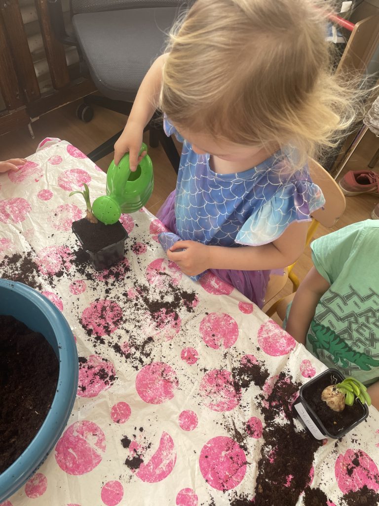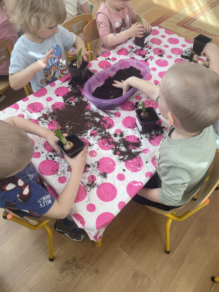 Kolejnym ważnym elementem naszych wiosennych aktywności było sadzenie kwiatów. Dzieci samodzielnie przygotowywały doniczki, wsypywały ziemię i sadziły rośliny. Następnie uczyły się, jak należy o nie dbać, aby mogły pięknie rosnąć i kwitnąć. To doskonała lekcja odpowiedzialności oraz troski o przyrodę.