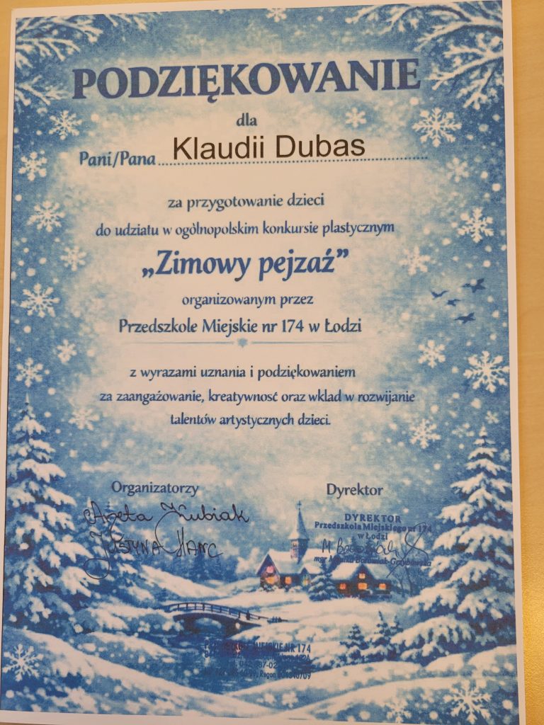 Natalia K. z gr. VII oraz Alicja R. z gr. IX wzięły udział w ogólnopolskim konkursie plastycznym pn. „Zimowy pejzaż”. Organizator konkursu: Przedszkole Miejskie Nr 174 w Łodzi.